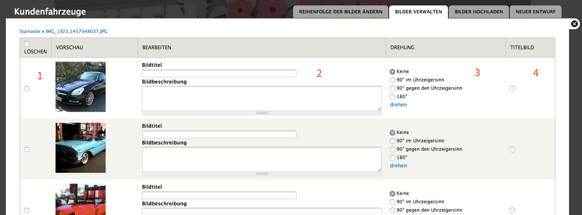 - 1: Irrtümlich zur Galerie hinzugefügte Bilder wieder löschen, in dem Sie in der betreffenden Zeile das Häkchen bei Löschen setzen.