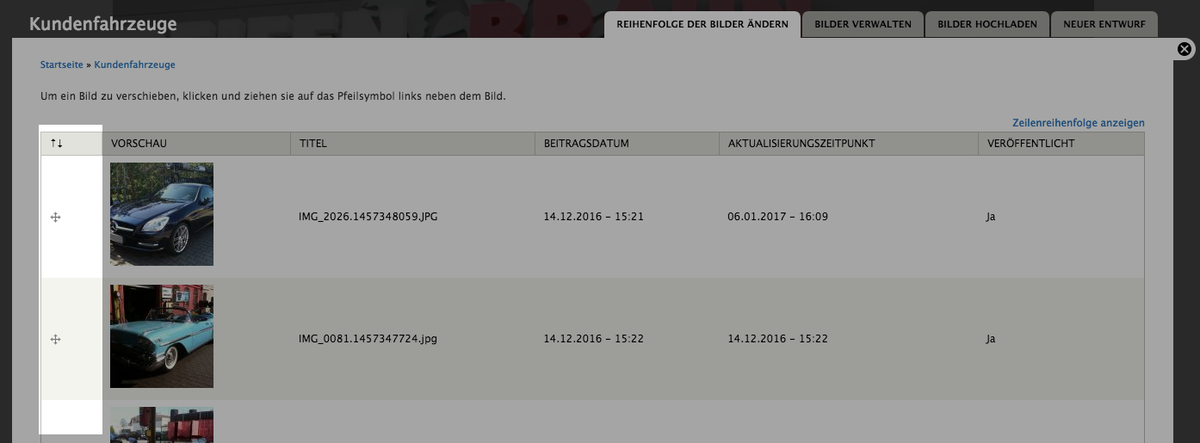 Um ein Bild zu verschieben, klicken und ziehen sie auf das Pfeilsymbol links neben dem Bild. Klicken Sie danach auf Eigene Reihenfolge speichern.