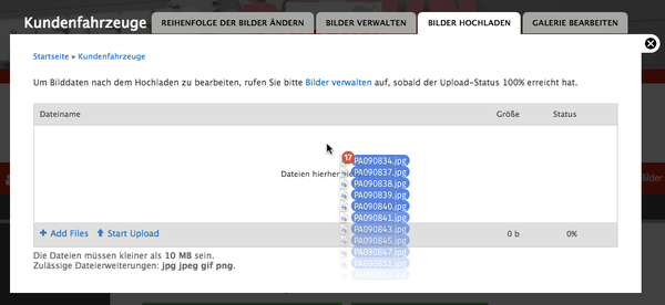 Wählen Sie per Klick auf Add files beliebig viele Bilddateien von Ihrem Rechner aus oder ziehen Sie die Dateien direkt in das Fenster. Laden Sie die Dateien dann per Klick auf Start Upload hoch. Wichtig: Verlassen Sie die Seite nicht, bis die Prozentanzeige unten rechts 100% anzeigt.