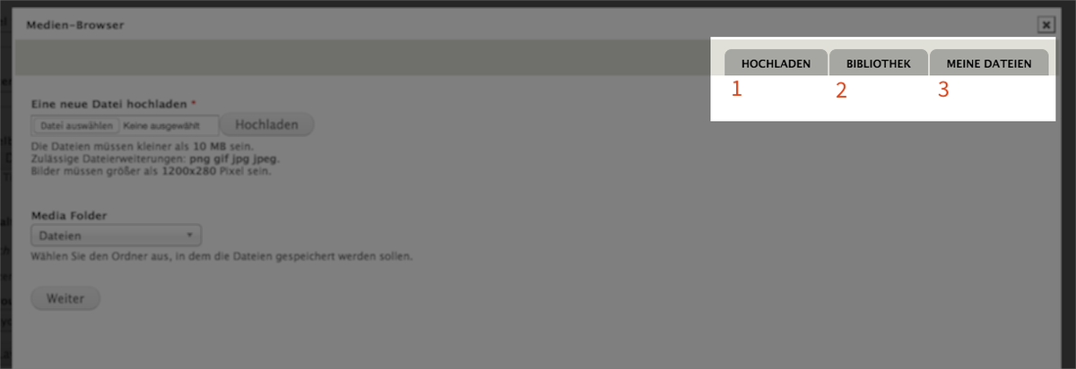 Dort haben Sie die Möglichkeit, eine neue Datei hochzuladen (1) oder eine bereits vorhandene Datei aus dem gesammelten Medien-Archiv der Website (2) oder dem Katalog der von Ihnen bereits vorher hochgeladenen Dateien (3) auszuwählen.