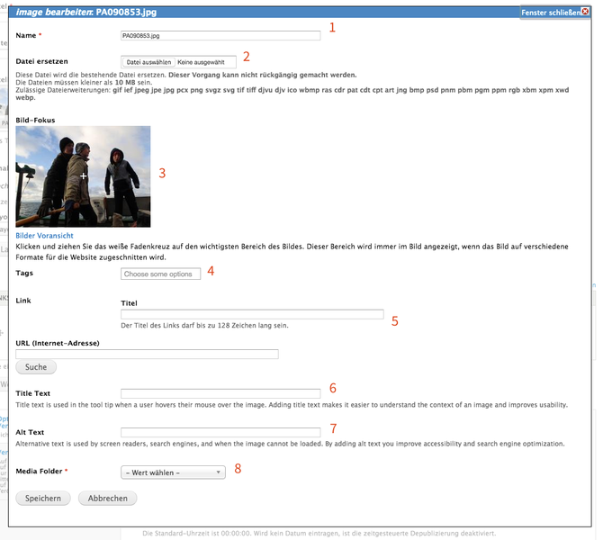 5. Link: Geben Sie hier einen Link ein, mit dem das Bild später auf der Website verlinkt werden soll. Bitte beachten Sie, dass je nach Einsatzzweck des Bildes (z.B. als Titelbild) der Link nicht immer verwendet wird.