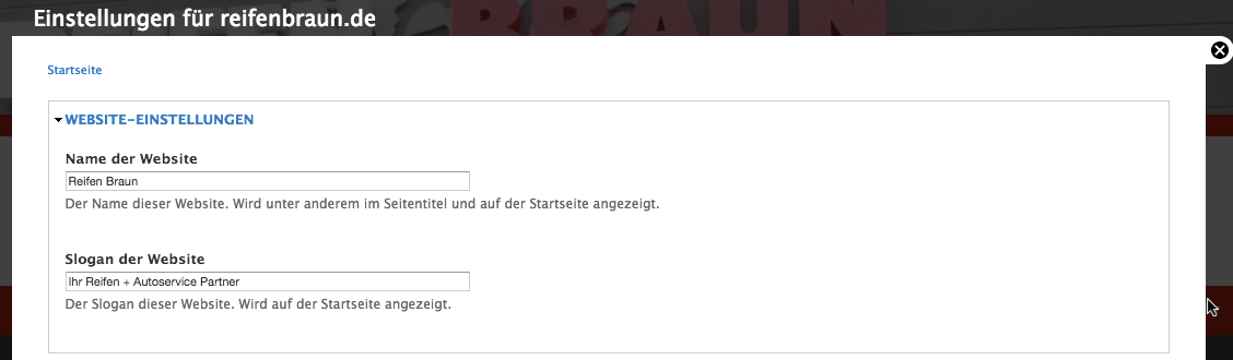 Nach einem Klick auf Website-Einstellungen auf der Startseite Ihrer Website öffnet sich ein Fomular, mit dem Sie grundlegende Eigenschaften Ihrer Website ändern können. Im einzelnen sind das: