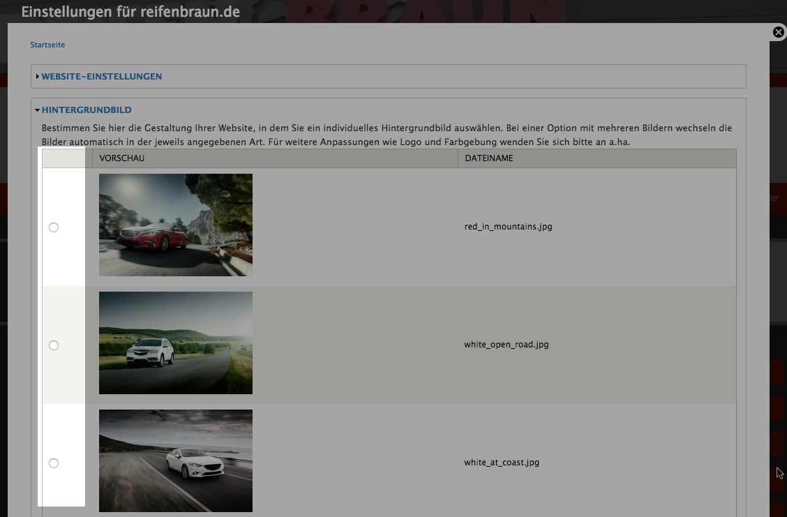 Wählen Sie über die Auswahl-Buttons in der linken Spalte das gewünschte Hintergrundbild Ihrer Website aus.