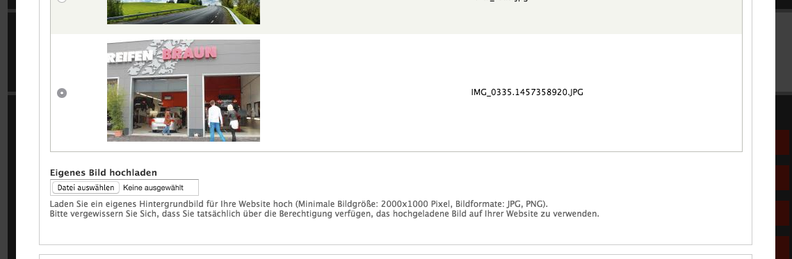 Über das Datei-Auswahlfeld unter der Bildliste können Sie ein eigenes Bild für Ihre Website hochladen, dass dann automatisch als Hintergrundbild verwendet wird.