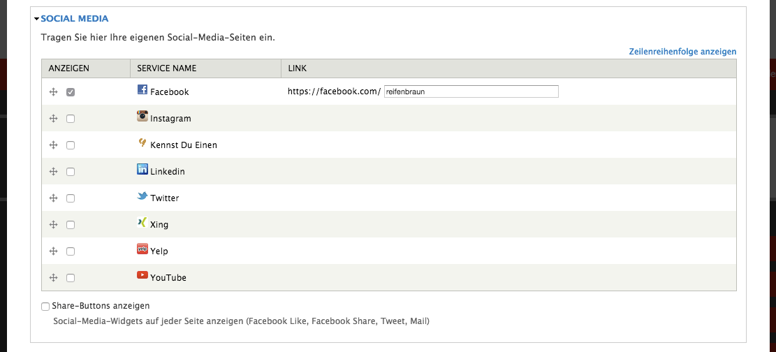 Wählen Sie aus, welche Social-Media-Links auf Ihrer Website angezeigt werden sollen. Für jeden ausgewählten Dienst (Facebook, Twitter etc.) erscheint dann rechts in der Tabelle ein Eingabefeld, in dem Sie den Link zu dem betreffenden Dienst vervollständigen müssen.